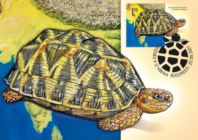 On the stamp with the face value of Lei 1.70 is represented the Indian star tortoise (Geochelone elegans), which lives in arid areas of India, Pakistan and Sri Lanka. It is a vulnerable species, rarer, because many specimens are caught to be sold in the illicit trade in exotic animals, this turtle being sought as a pet, due to the attractive appearance of the carapace.