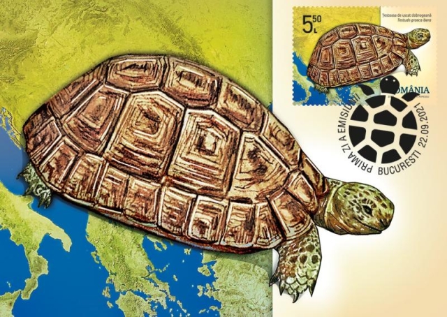 On the stamp with the face value of Lei 5.50 is illustrated the Greek tortoise (Testudo graeca ibera). The species is widespread in northern Africa, southwest Asia and southern Europe, and the subspecies ibera is present in southern Serbia, Greece, Bulgaria, Romania and even Iran. In our country, it is found only in Dobrudja. The Greek tortoise has a brown shell, 14-30 cm long, and has a horny spur on each back leg. It mainly populates the steppe meadows with bushes and rocks, but it also enters forests.