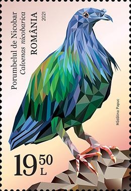 The stamp with the face value of Lei 19.50 presents the Nicobar pigeon (Caloenas nicobarica). This species lives on numerous islands of the Indian Ocean and Pacific Ocean (among which Nicobar Islands situated at East of India) and in coastal areas of South-East Asia. This is a large pigeon measuring 40 cm in length. These birds usually live in colonies; they eat fruits, seeds and buds while flying from one island to another in search for food. The reduction of habitats, hunting and catching for clandestine trade lead to the decrease of their number and this is a near endangered species.