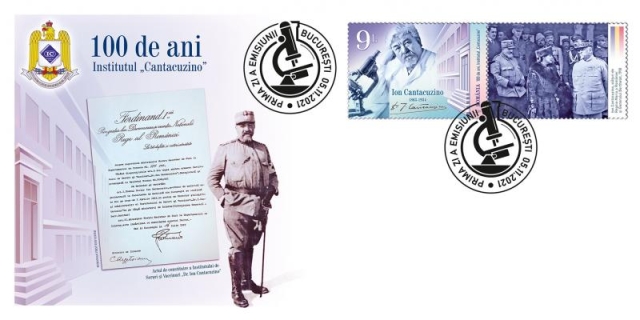 The issue consists of a stamp with the face value of Lei 9, which illustrates the portrait of Professor Ion Cantacuzino, an aspect of his work, a microscope and a detail of the facade of the Cantacuzino Institute building, being completed by a First Day Cover, which contains the stamp and a label depicting Queen Marie of Romania, along with Professor Ion Cantacuzino and General Henri Berthelot, during a visit to a hospital in the year of the Great Union, 1918. The thematic illustration of the First Day Cover presents in facsimile the Decree signed by King Ferdinand I on April 1, 1921, by which the Institute of Serums and Vaccines “Dr. I. Cantacuzino” was founded.