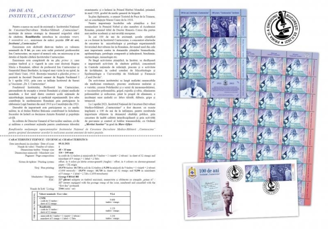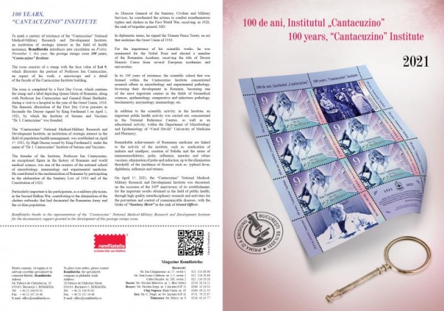 The postage stamps issue 100 years, “Cantacuzino” Institute will be available on Friday, 5th of November 2021, in Romfilatelia’s shops network in Bucharest, Bacau, Brasov, Cluj-Napoca, Iasi and Timisoara and online on http://romfilatelia.ro/store/.
