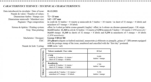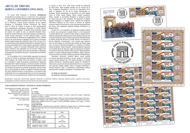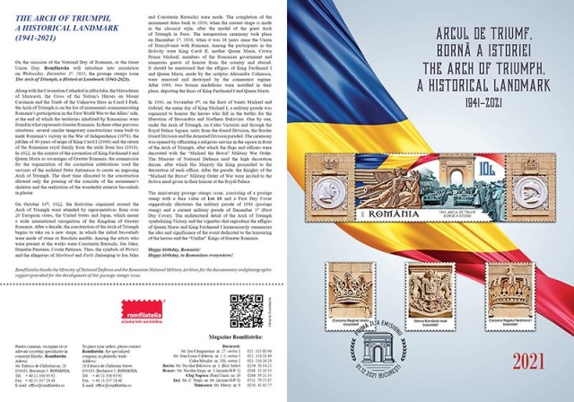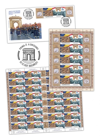The postage stamps issue “The Arch of Triumph, a Historical Landmark (1941-2021)” will be available on Wednesday, 01th of December 2021, in Romfilatelia’s shops network in Bucharest, Bacau, Brasov, Cluj-Napoca, Iasi and Timisoara and online on http://romfilatelia.ro/store/.