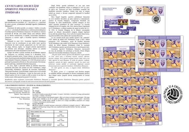 Romfilatelia thanks the Politehnica Timișoara University and the Politehnica Timișoara Sports Society for the documentary and photographic support provided to the development of this postage stamps issue.