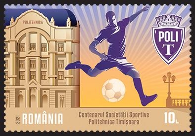 The issue, containing 1 stamp and a “First Day” Cover, is dedicated to the celebration of a hundred years since the founding of the Politehnica Timișoara Sports Society. The stamp with the value of Lei 10 depicts the silhouette of a football player next to an architectural detail of the facade of the Politehnica University Timișoara and the current logo of the Politehnica Timișoara Sports Society.