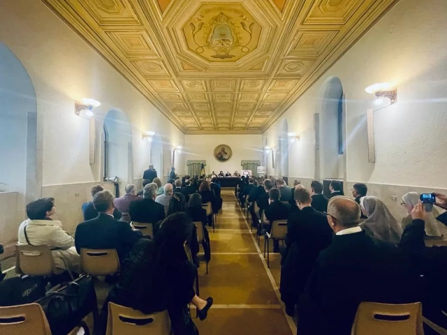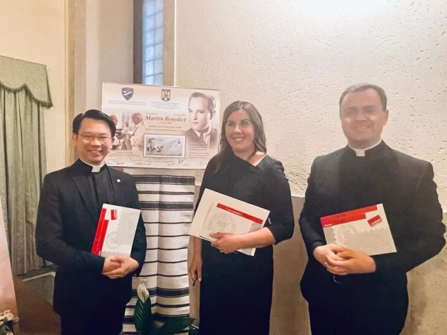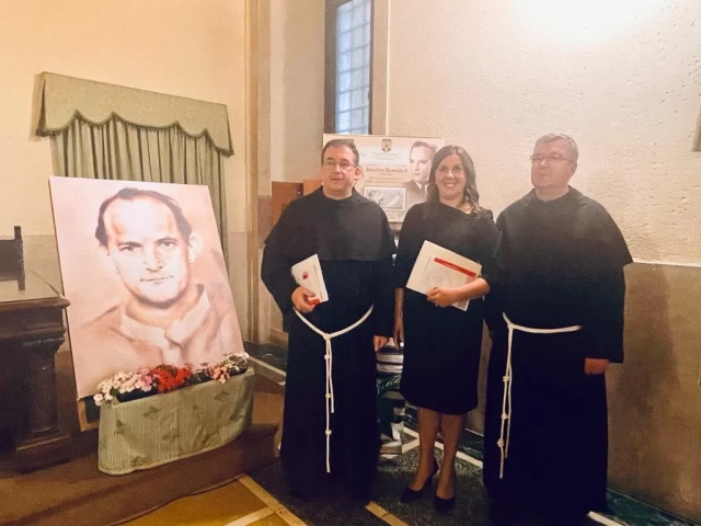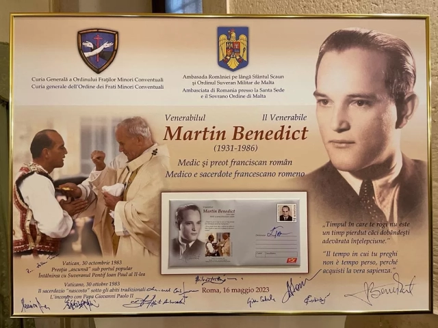 Speakers were Adina Lovin, Charge d’Affaires a.i., Embassy of Romania to the Holy See, Carlos Trovareli OFM Conv., Minister General of the Order of Friars Minor Conventual, His Eminence Cardinal Marcello Semeraro, Prefect of the Dicastery for the Causes of Saints, Silvestru Bejan OFM Conv., Professor of Theology of Religions at the Theological Institute of Assisi and the Pontifical Theological Faculty of San Bonaventura Seraphicum in Rome, Eusebiu Bejan OFM Conv., vice-postulator of the Martin Benedict Cause and professor of Dogmatic Theology at the Franciscan Theological Institute in Roman, Germina Nagâț, CNSAS (the National Council for the Securitate Archives) member and Luminița Toncu, Promotion Director for Romfilatelia.