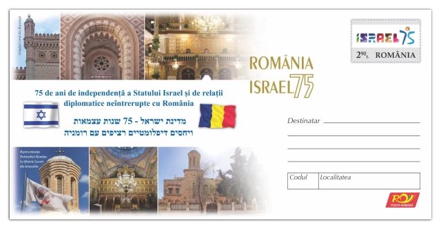 In order to honour the 75th anniversary of the State of Israel, Romfilatelia, in collaboration with the Embassy of the State of Israel in Bucharest, has issued a special philatelic product with images of the symbols of the two states, Romania and Israel, the representation of the Romanian Patriarchate at the Holy Places in Jerusalem and the exterior architecture of the Choral Temple in Bucharest.