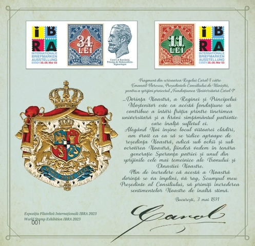 The collector’s block, (numbered), with the two imperforated postage stamps, includes in its graphics the royal coat of arms of Romania and a fragment of the text of a letter addressed by King Carol I (on May 3rd, 1891) to the President of the Council of Ministers, Emanoil Florescu, in order to obtain concrete support for the achievement of the project that envisaged the “Carol I” University Foundation (known today as the “Carol I” Central University Library). The signature (reproduced) of King Carol I lends the product a character of official nobility.
