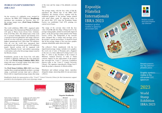 Romfilatelia, present at the Essen Fair, will make available to philatelic enthusiasts the issue dedicated to the event (World Stamp Exhibition IBRA 2023) along with series of postage stamps from other issues with themes appreciated by collectors.