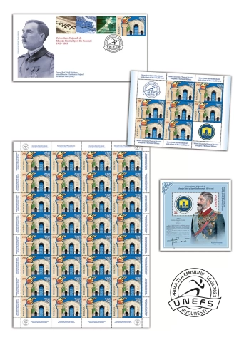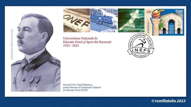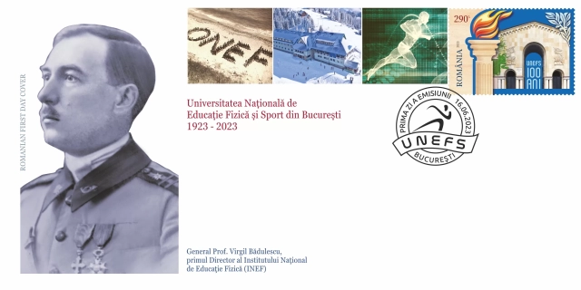 On the image of the First Day Cover of the issue, the portrait of General Prof. Virgil Bădulescu, First Director of the National Institute of Physical Education (INEF) is reproduced, and the stamp is associated with the upper part of the envelope, images of UNEFS locations – ONEF-Beach, Cabin in Parâng, winter and the silhouette of a runner on a sine wave background, rendering the dynamics.