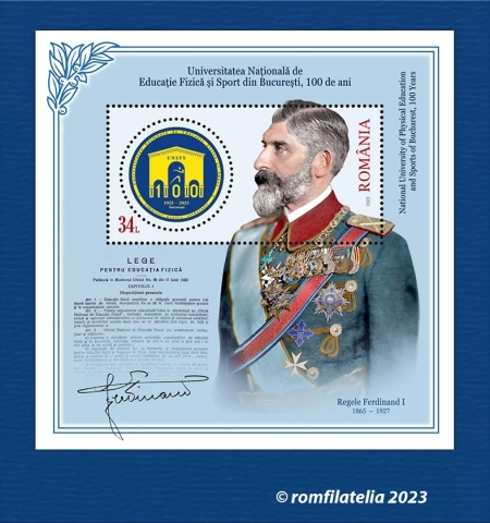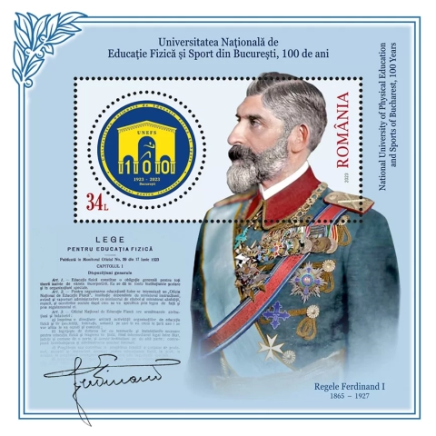 In the graphic composition of the perforated souvenir sheet having the stamp with the face value of Lei 34, the bust of King Ferdinand I, the signatory of the Law on Physical Education, is illustrated, alongside a facsimile of the text of the Law. The UNEFS anniversary logo is reproduced in the perforation of the stamp of the souvenir sheet.