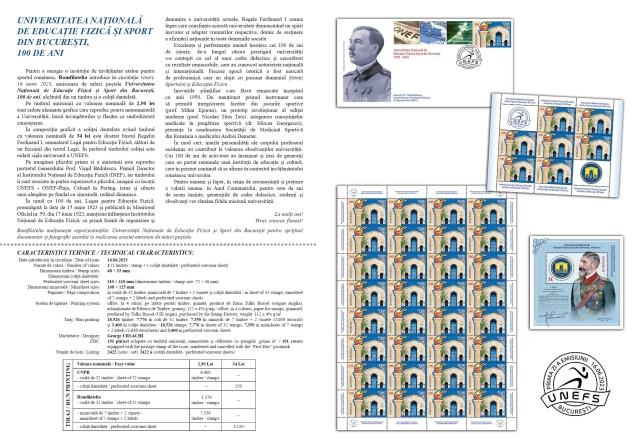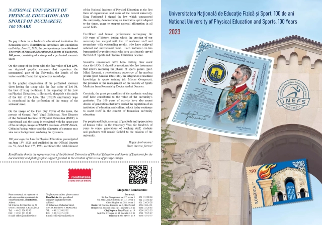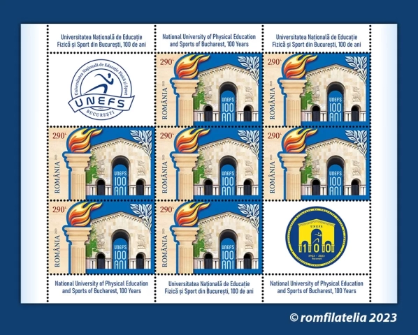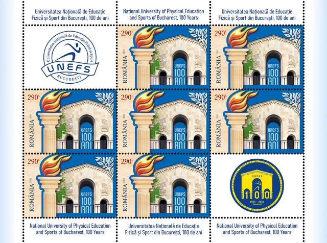 To pay tribute to a landmark educational institution for Romanian sports, Romfilatelia introduces into circulation on Friday, June 16, 2023, the postage stamps issue National University of Physical Education and Sports of Bucharest, 100 years, consisting of a stamp and a perforated souvenir sheet.