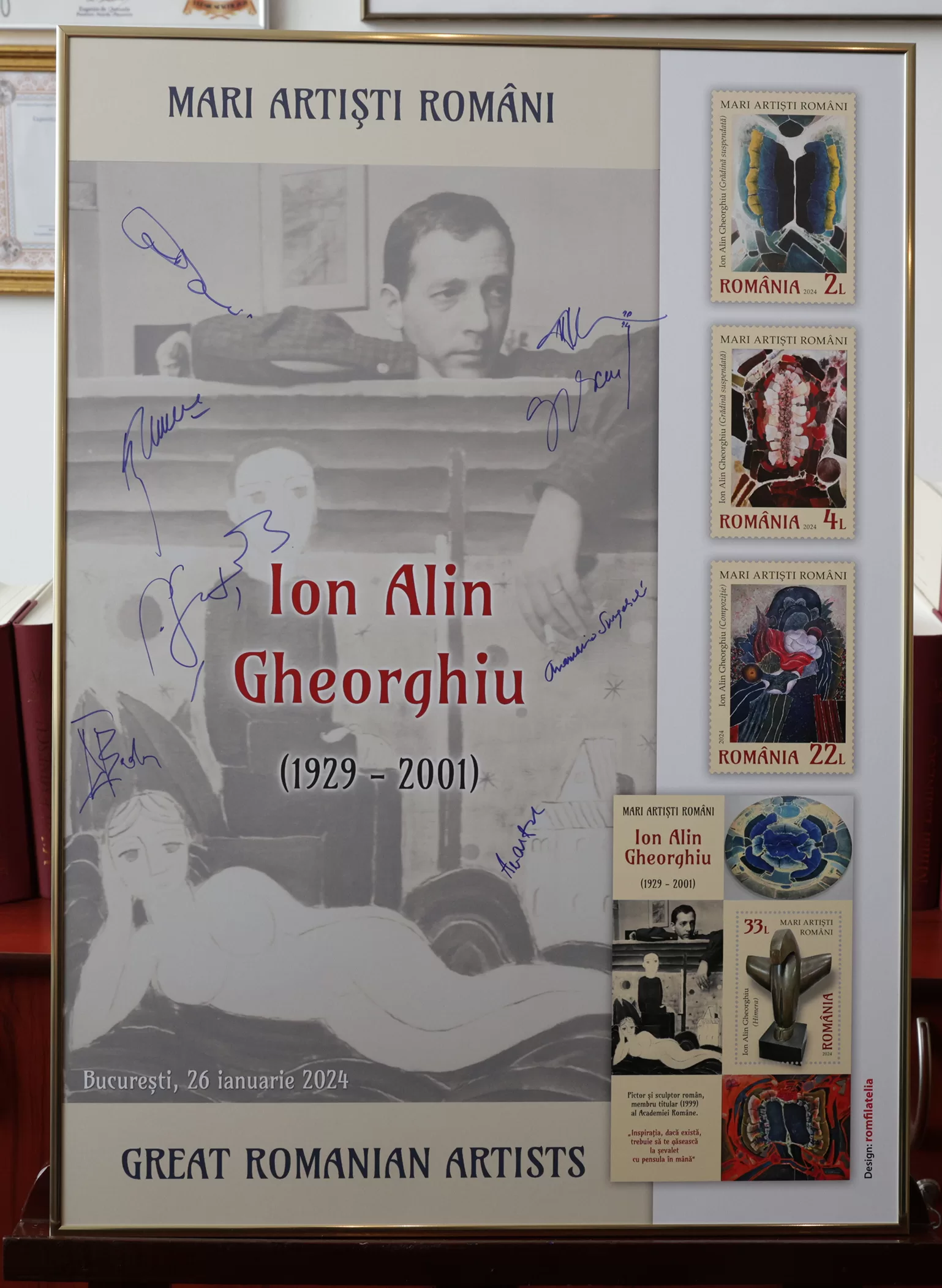București, 26 ianuarie 2024 Maestrul Ion Alin Gheorghiu omagiat de filatelia românească „Inspirația, dacă există, trebuie să te găsească la șevalet cu pensula în mână” Romfilatelia a lansat, la sediul său, emisiunea de mărci poștale „Mari artiști români. Ion Alin Gheorghiu”, dedicată artei sale, aducând în atenția colecționarilor și iubitorilor de frumos, unul dintre cei