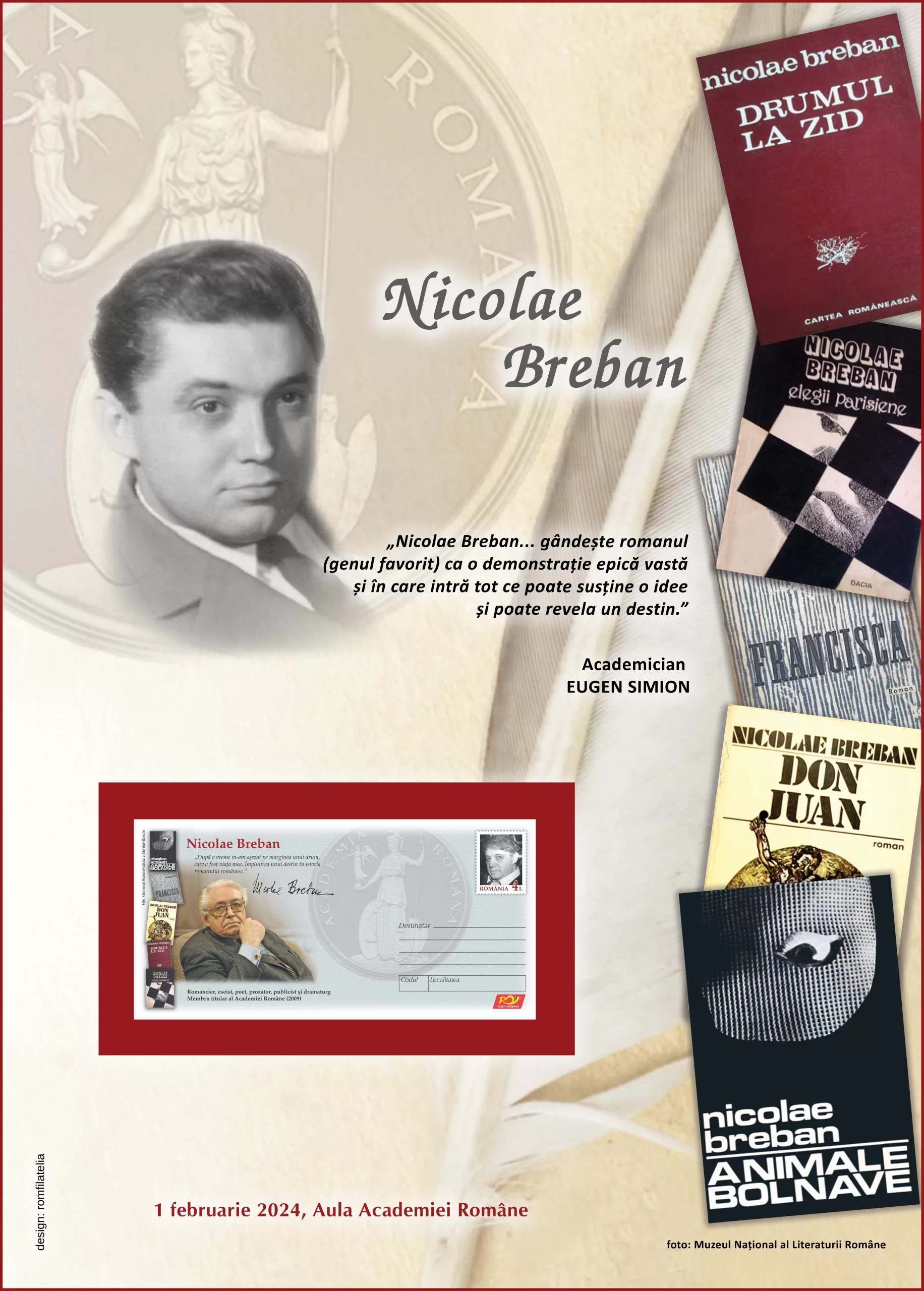 București, 1 februarie 2024 Academia Română a organizat astăzi, Sesiunea aniversară „Nicolae Breban – 90“. Romfilatelia s-a afirmat încă de la înființarea sa, în urmă cu două decenii, ca prezență activă în calendarul evenimentelor culturale și al celor legate de istoria și valorile de tezaur uman sau material, ale României. Romfilatelia, invitată la evenimentul găzduit