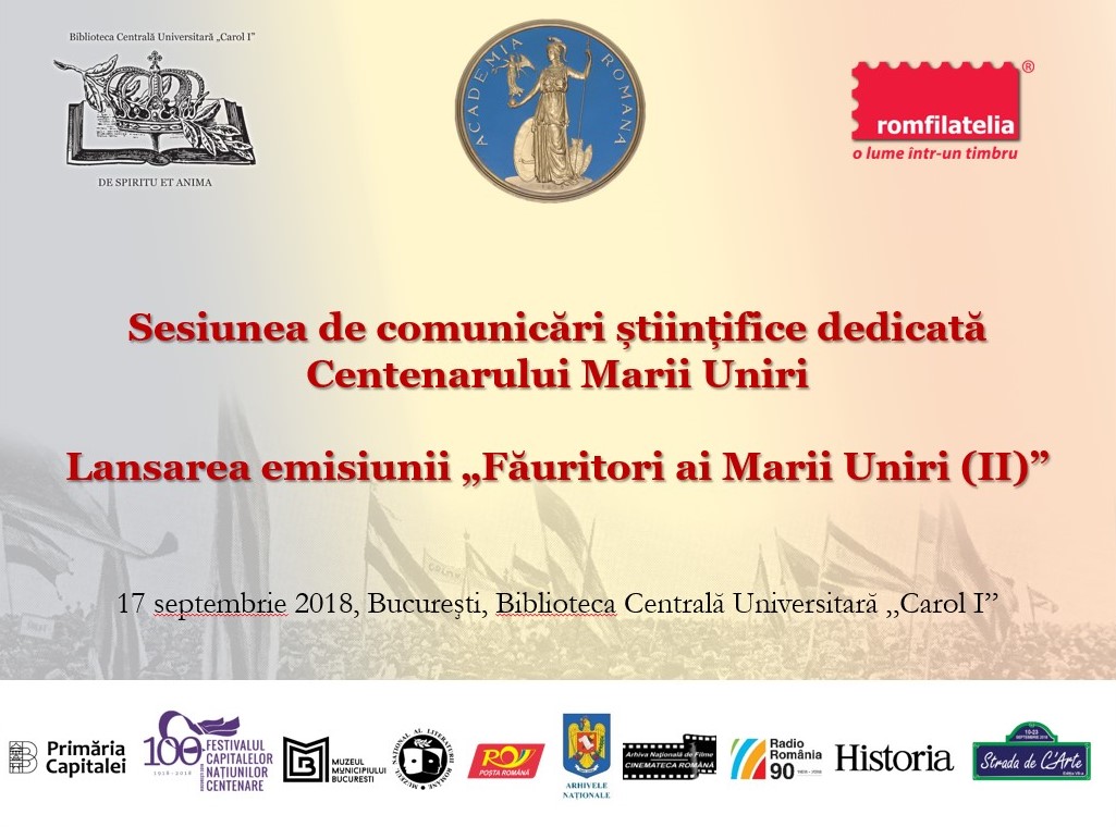 Aula Bibliotecii Centrale Universitare „Carol I” a găzduit luni, 17 septembrie sesiunea de comunicări științifice dedicată Centenarului Marii Uniri și lansarea emisiunii de mărci poștale Făuritori ai Marii Uniri (II), manifestare înscrisă in programul Festivalului Capitalelor Națiunilor Centenare precum și al Festivalulului Strada de C’Arte 2018. Evenimentul a fost deschis de gazda evenimentului, doamna conf. […]