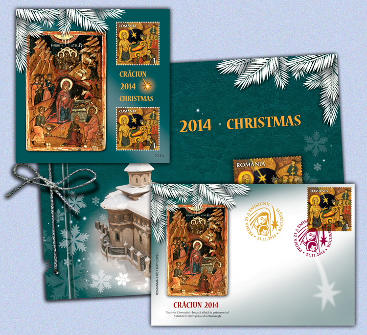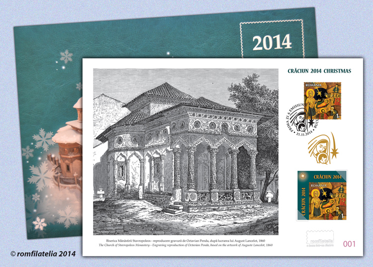 Stampă Biserica Stavropoleos (reproducere după gravură de Octavian Penda) – produs exclusiv, concept Romfilatelia, realizat într-un tiraj limitat de 227 exemplare. Este echipată cu un timbru dantelat cu ştampila „prima zi” a emisiunii şi un timbru nedantelat, ambele aparţinând emisiunii „Crăciun 2014”.