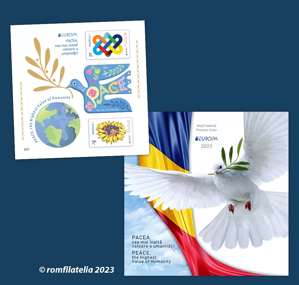 Mapa filatelică este realizată în tiraj limitat de 261 exemplare și este echipată cu blocul filatelic special de două timbre nedantelate al emisiunii, având imprimat în folio aur, ca simbol al Păcii, ramura de măslin. Blocul filatelic special este numerotat de la 001 la 261.